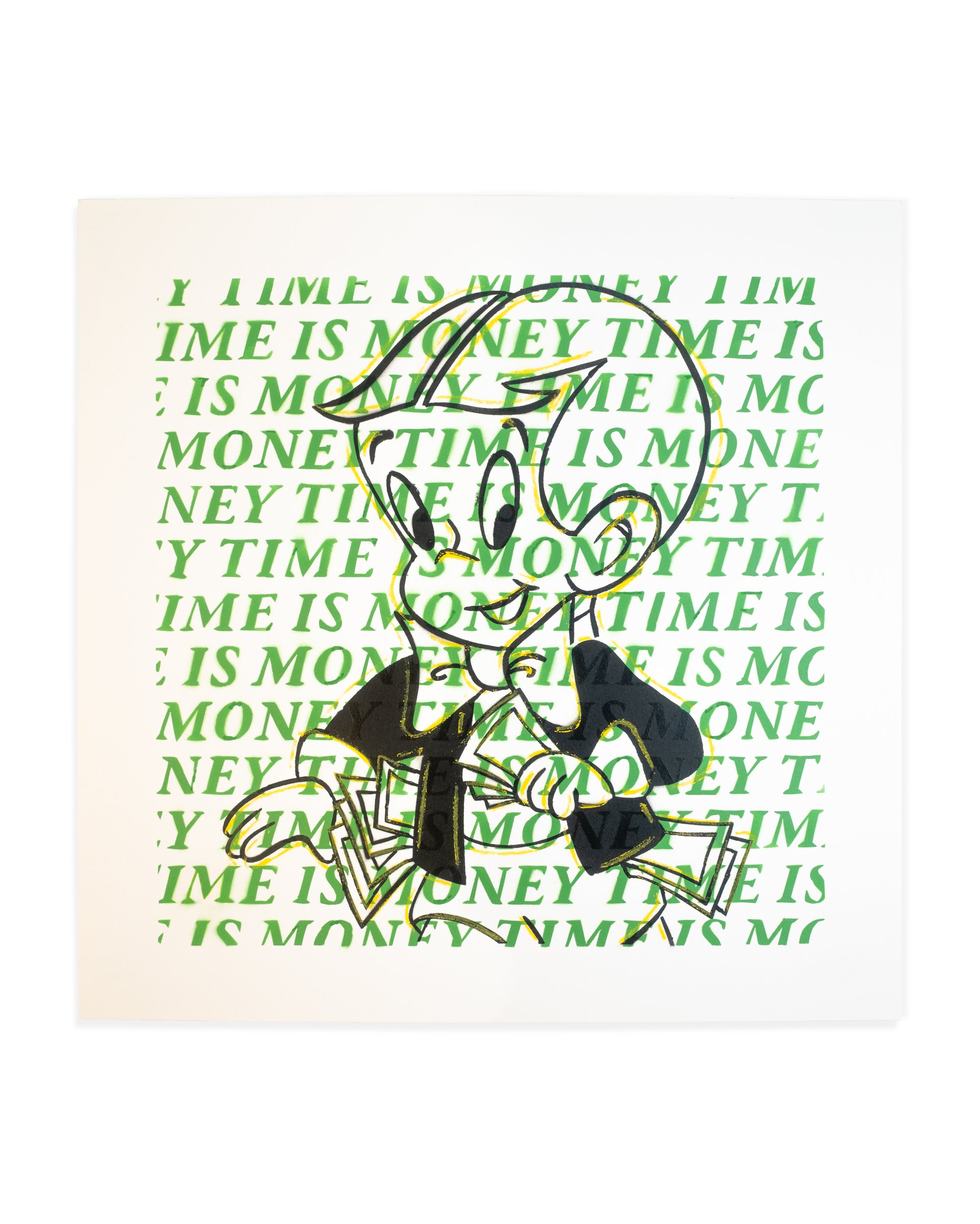 “Time is money” but in this piece, art takes the better deal. Richie Rich, the cartoon embodiment of wealth, sits frozen in abundance, smiling but never working for it. A playful yet pointed reflection on how we measure value.