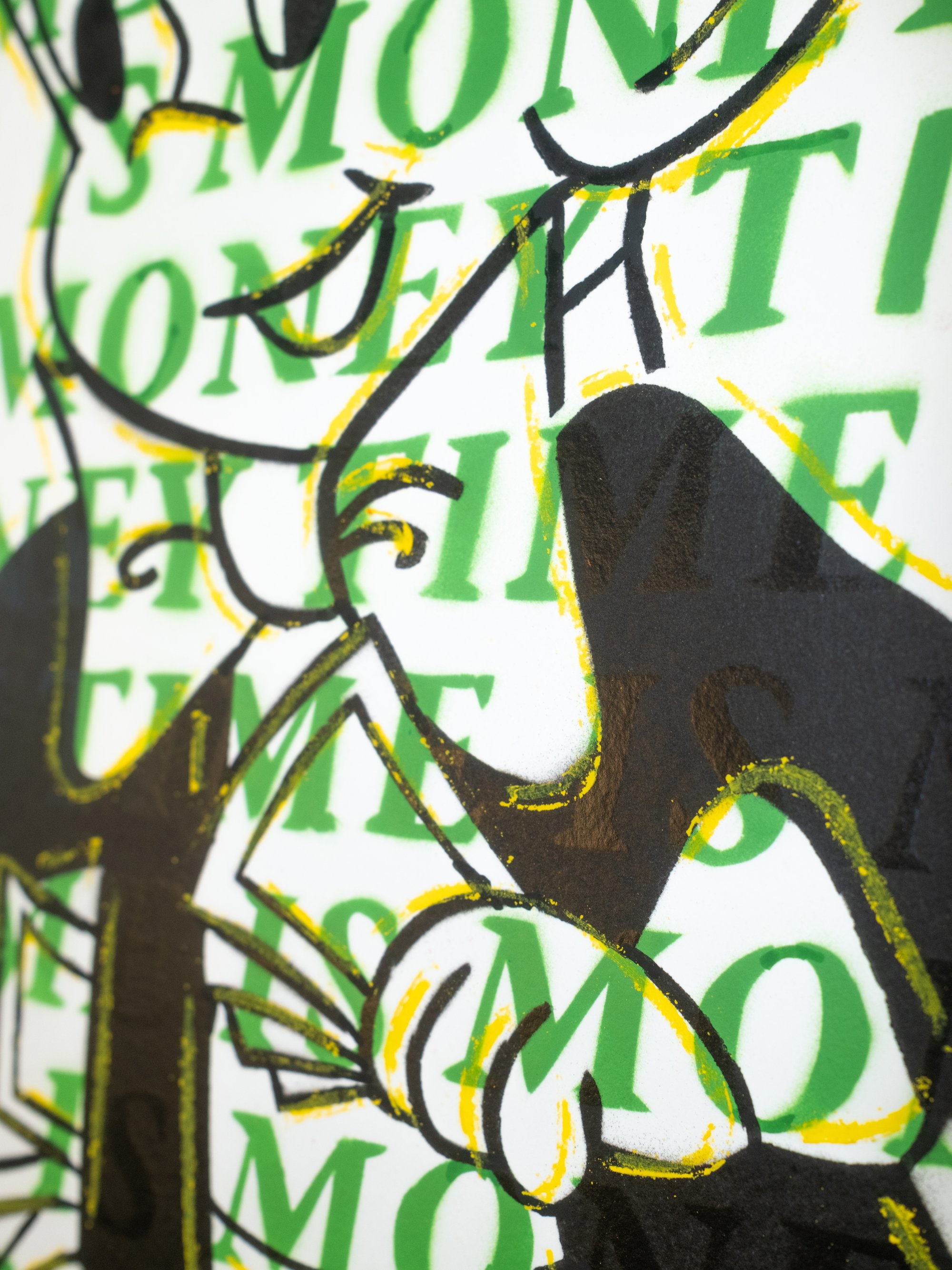 The process mirrors the concept; hand cut, slowly and deliberately, each cut builds focus and depth. Spray paint add energy and spontaneity, while yellow pastel finishing brings human texture. Overspray and subtle imperfections are all evident of the hand made nature of the work.